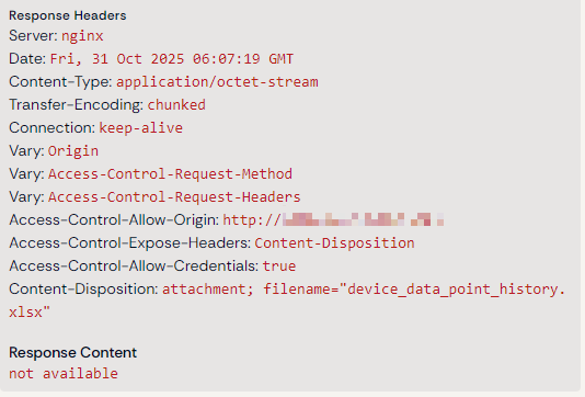 Hi, I have a button on my site to download history data in excel format. The button makes a POST request with payload and the server responses with "Content-Disposition" header set to "attachment", like the screenshot shows below.