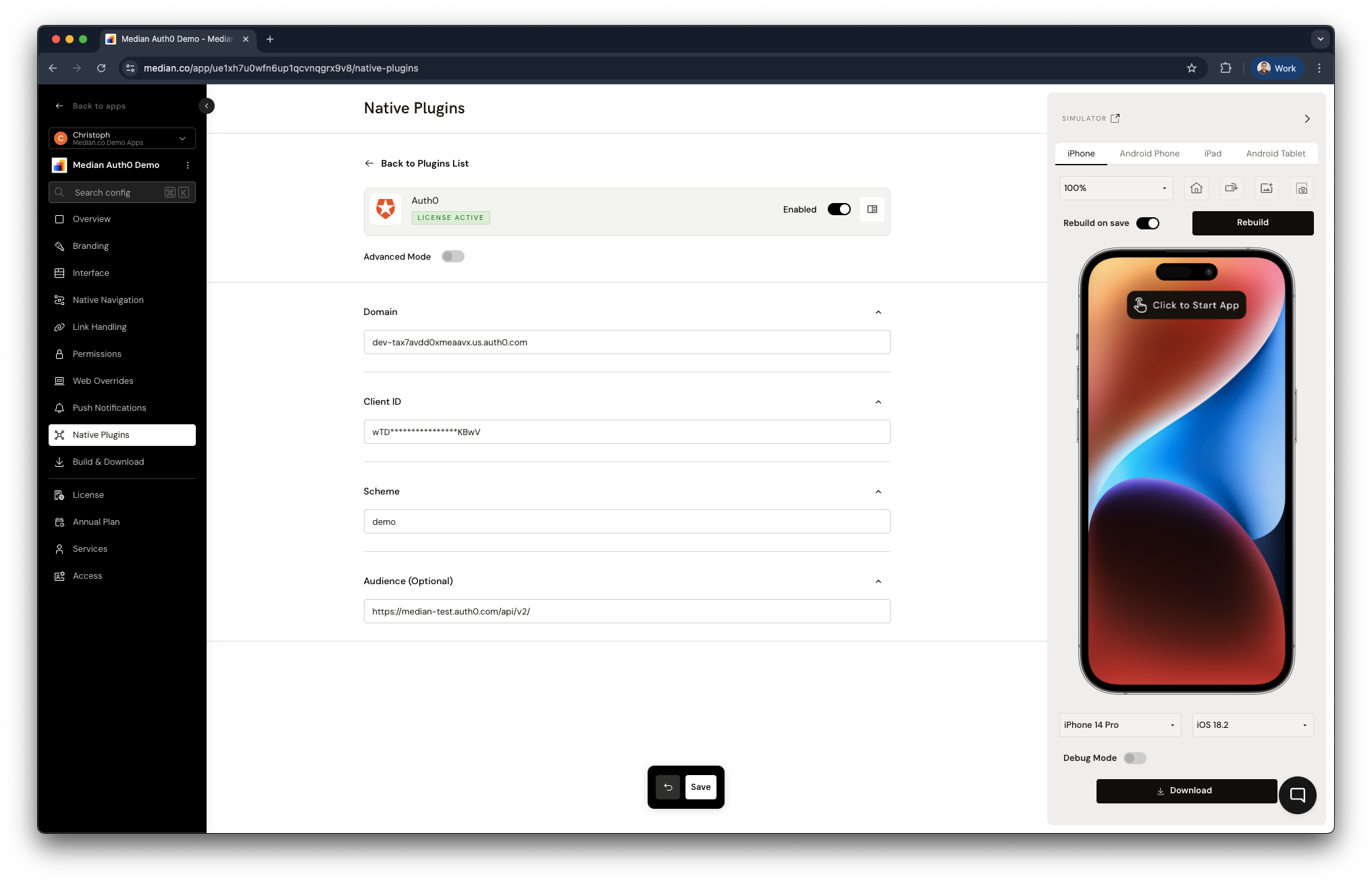 The Auth0 Native Plugin requires several parameters to be set in the App Studio, on the Native Plugins tab under "Advanced Mode". Sample parameters are as follows:
