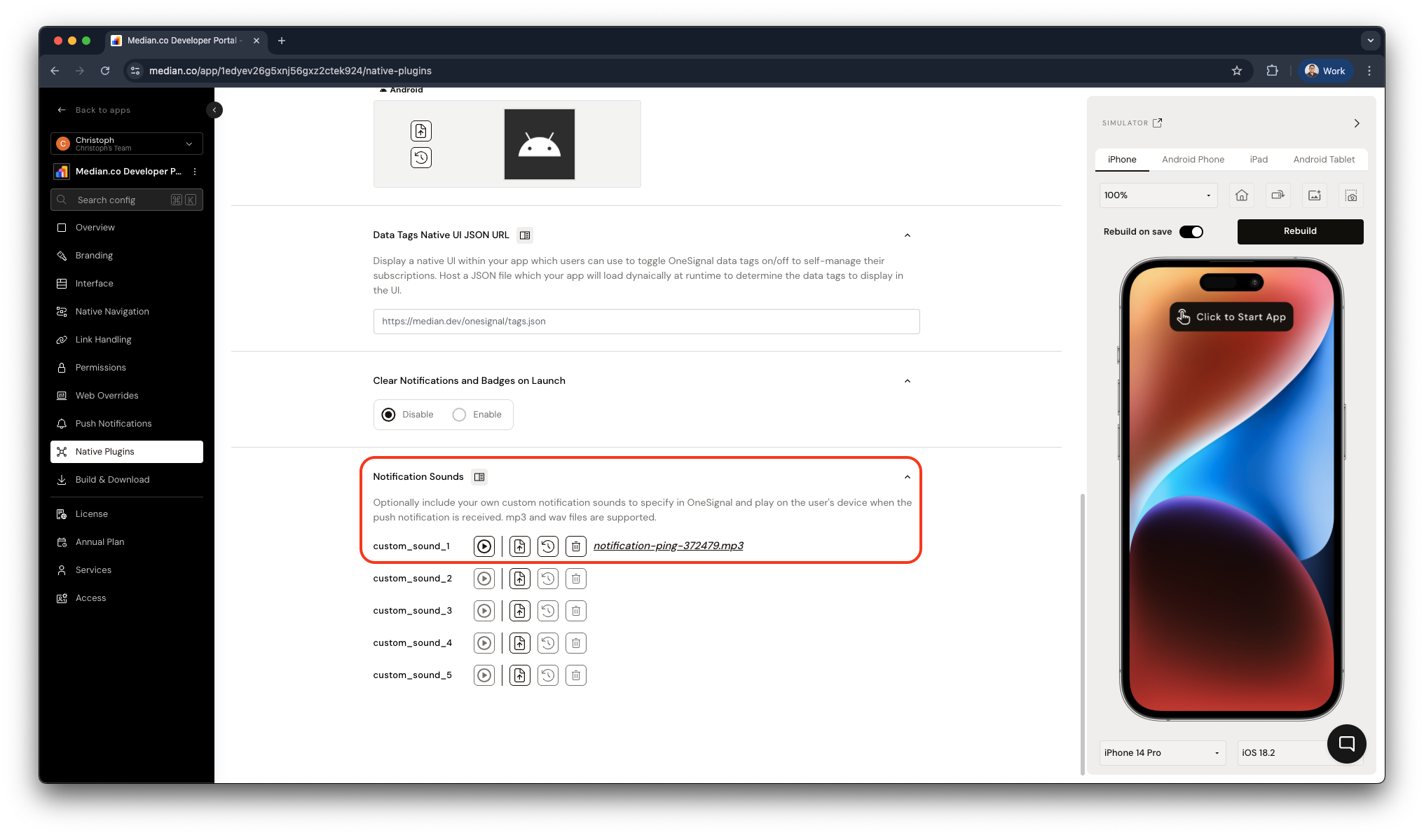 You can personalize your push notifications by specifying custom notification sounds. To do so, upload your audio files in the Notification Sounds section within the OneSignal Plugin Configuration in the App Studio. After uploading, your audio files will be converted to custom_sound_1, custom_sound_2, etc., instead of using the original filenames. The Median App Studio will automatically converts these files to .caf for iOS and .mp3 for Android when building your apps.