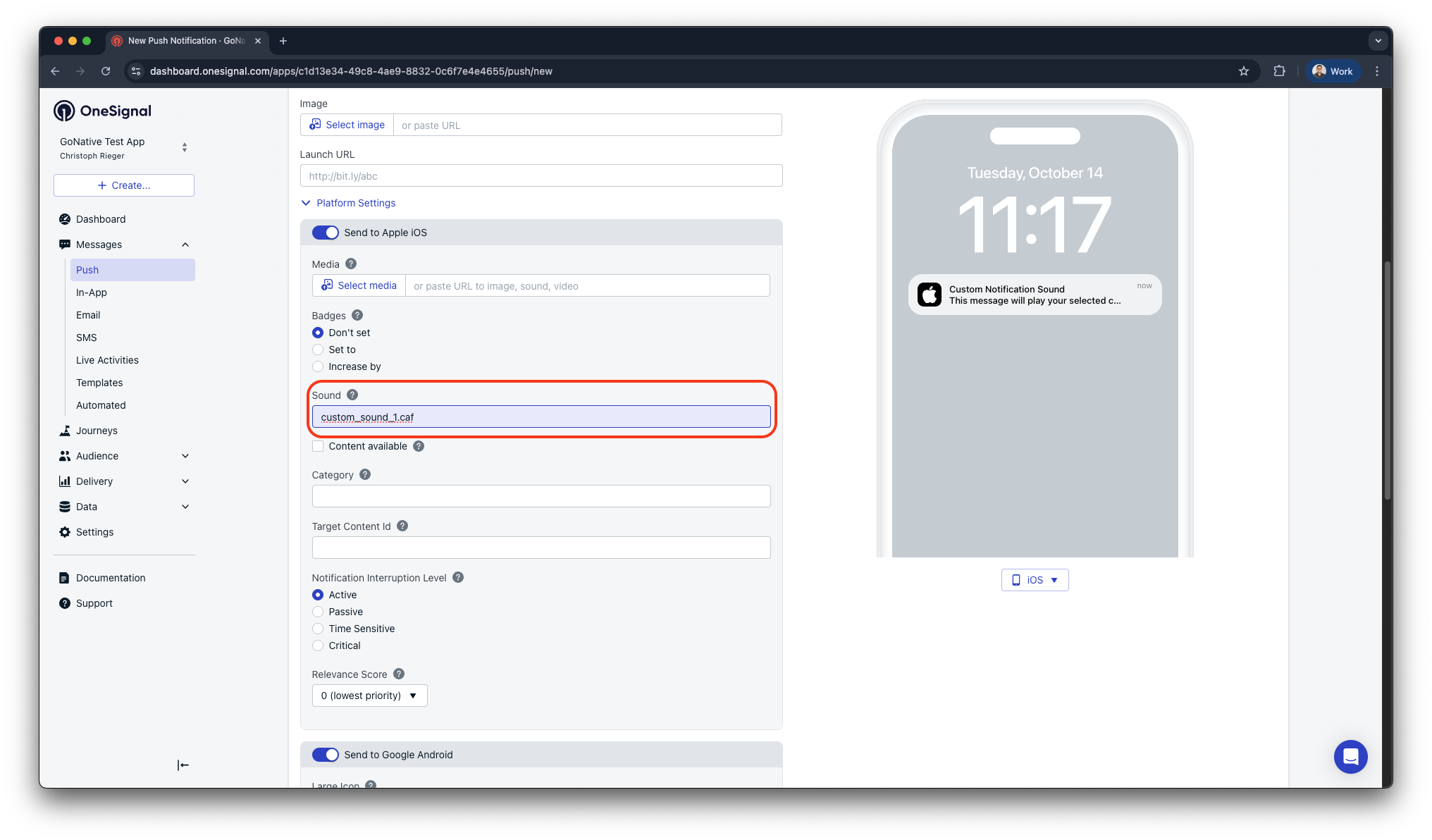 Please refer to the examples below on how to include custom notification sounds when drafting messages in the OneSignal Dashboard.
