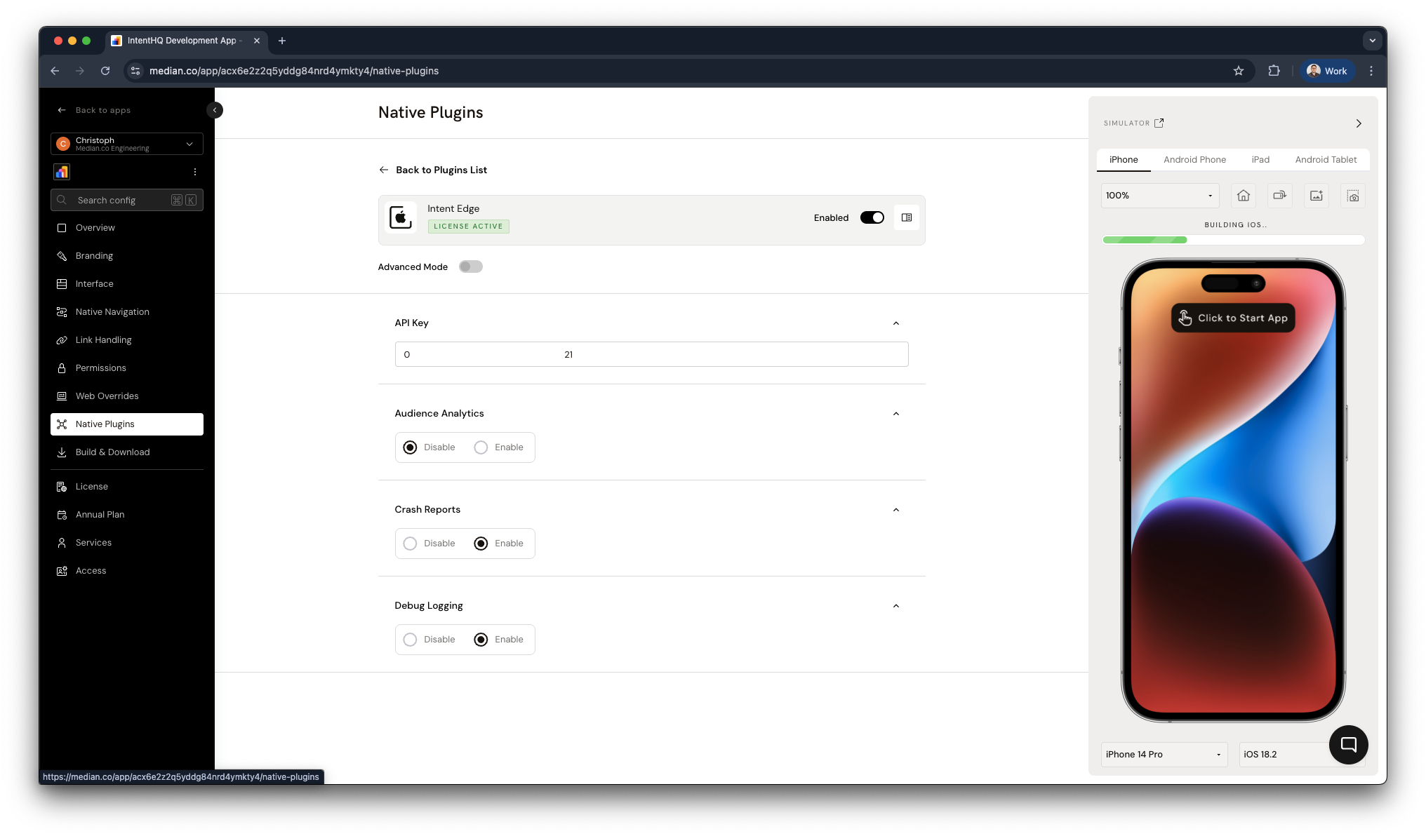 The Intent Edge Native Plugin requires you to provide a valid API key (provisioned by Intent HQ based on your App Identifiers) and offers several configuration options accessible via Native Plugins > Intent Edge.