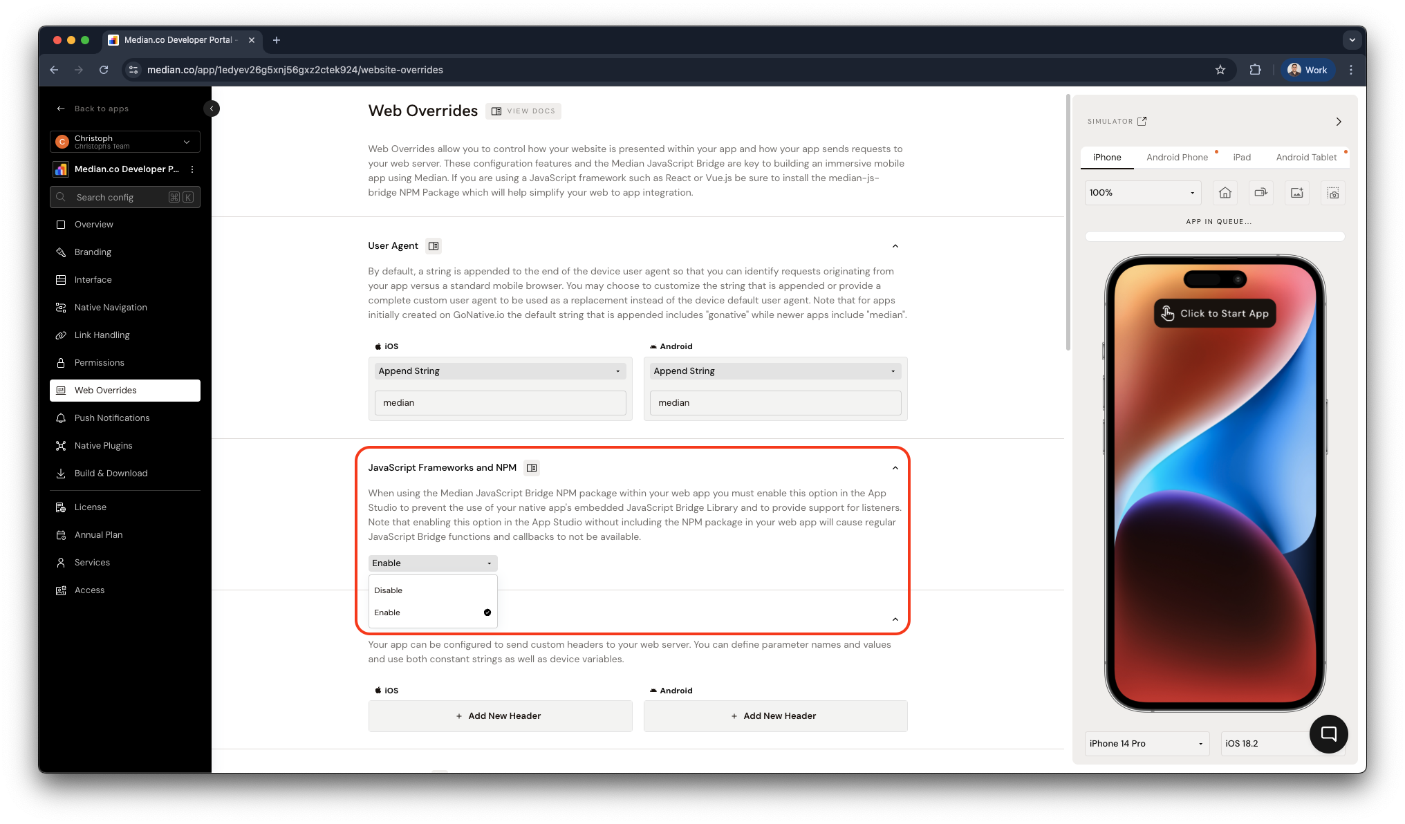 When utilizing the Median JavaScript Bridge NPM package in your web application, remember to enable the corresponding option in the App Studio (Website Overrides > JavaScript Frameworks and NPM).