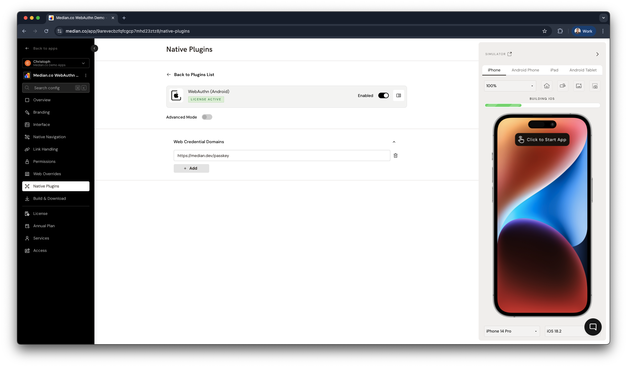 After completing the website configuration steps above, configure the WebAuthn plugin in Median App Studio: