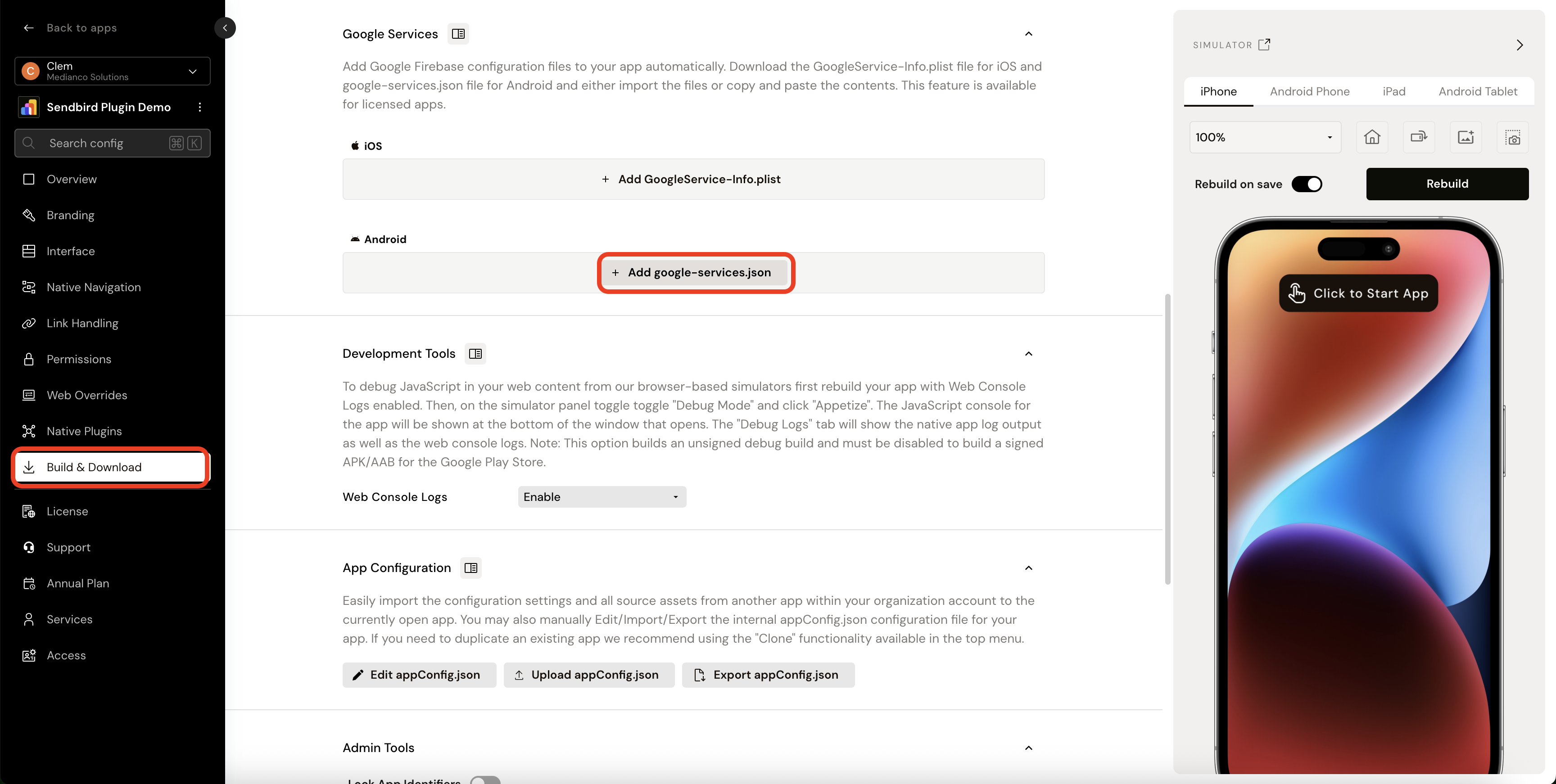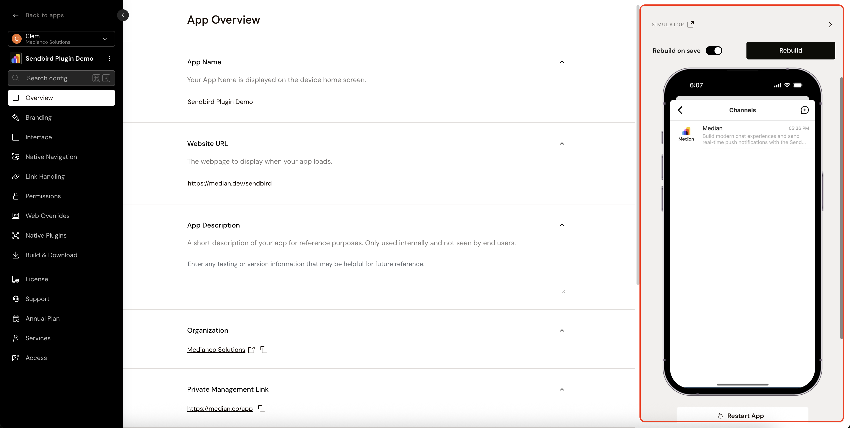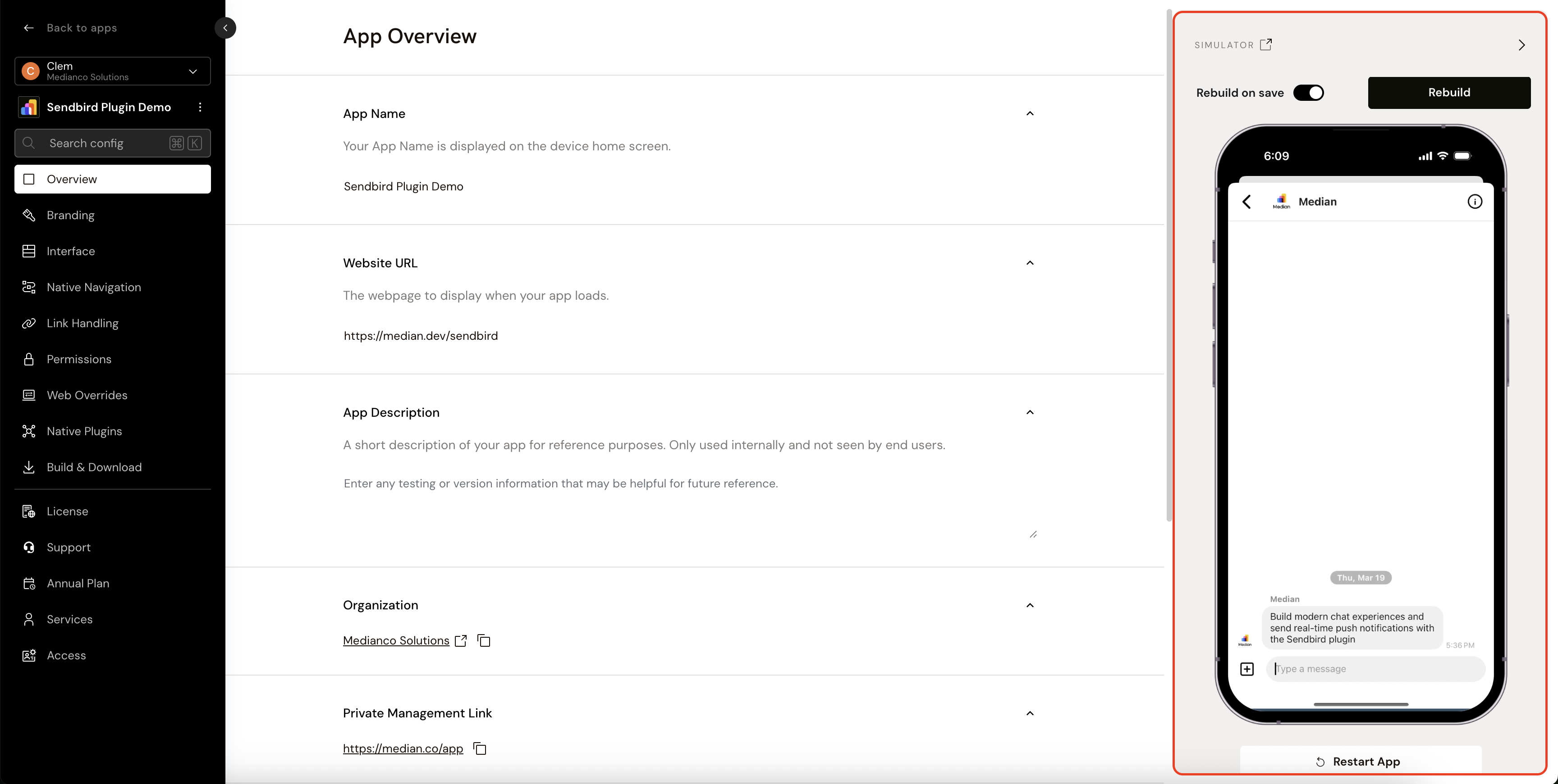 - Sendbird plugin is enabled in Median App Studio and a new build has been generated