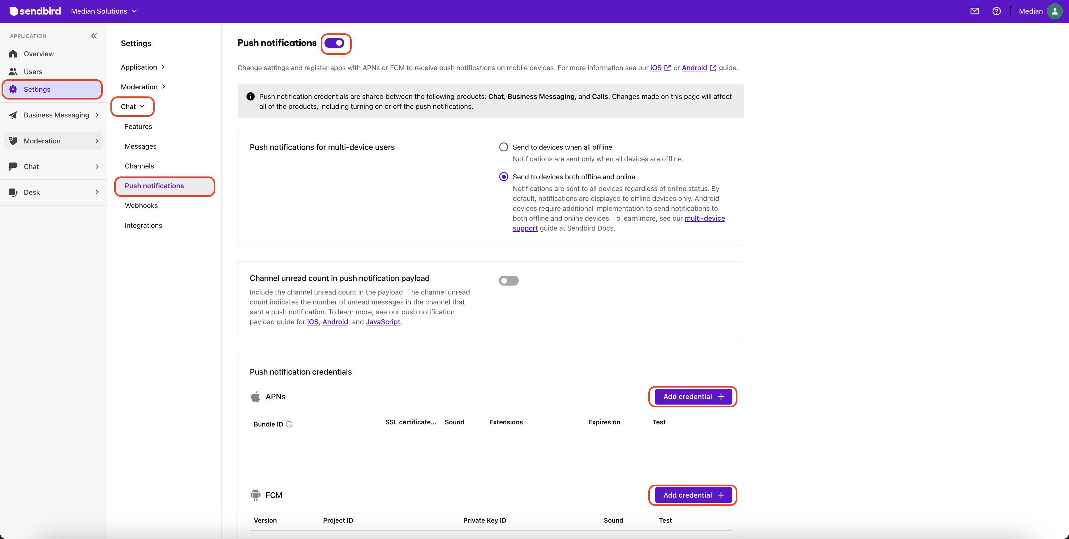 Configure Sendbird and push outside Median.co before or in parallel with the App Studio settings.