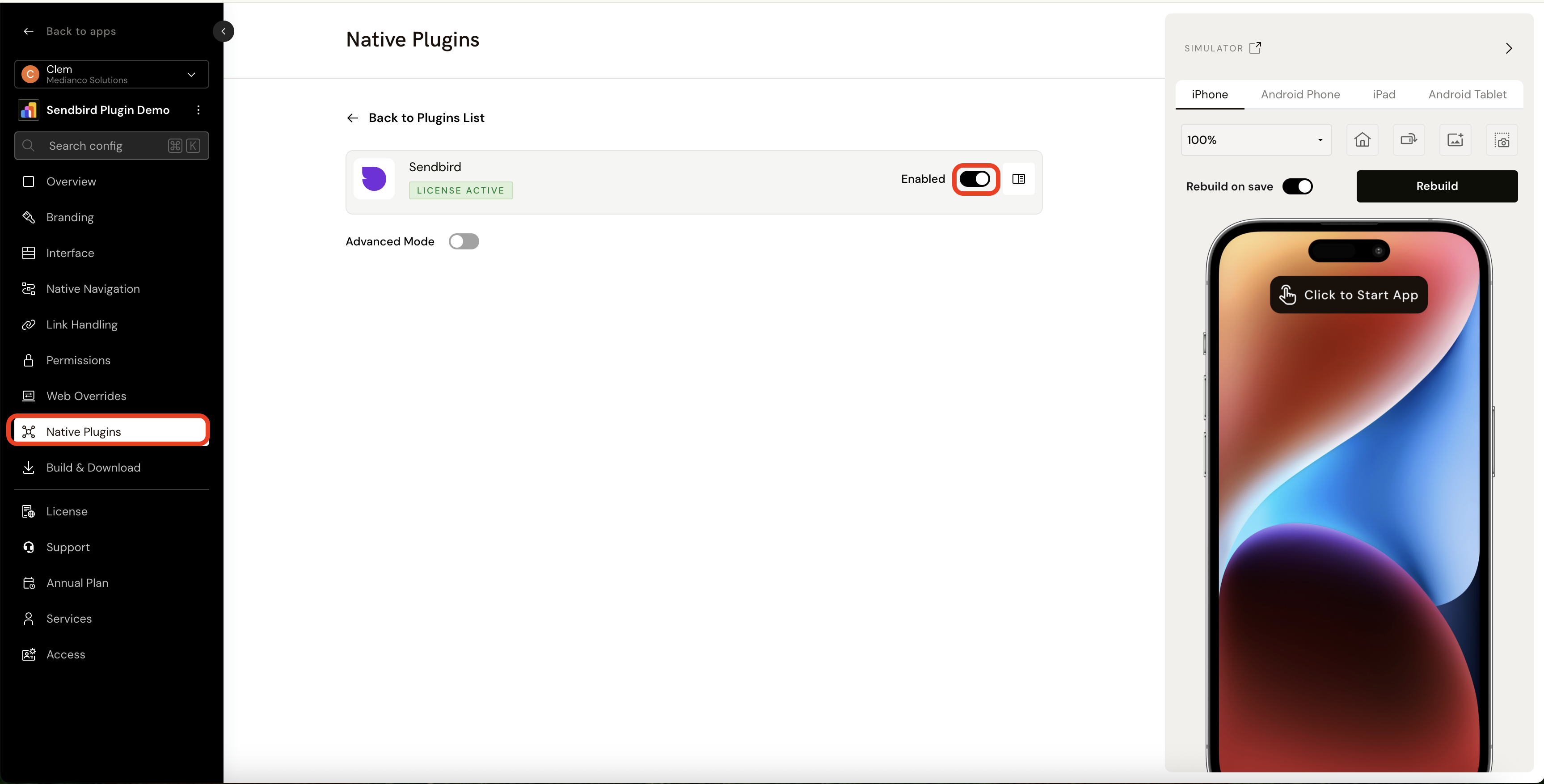 - In App Studio, open the Native Plugins tab and enable the Sendbird plugin.