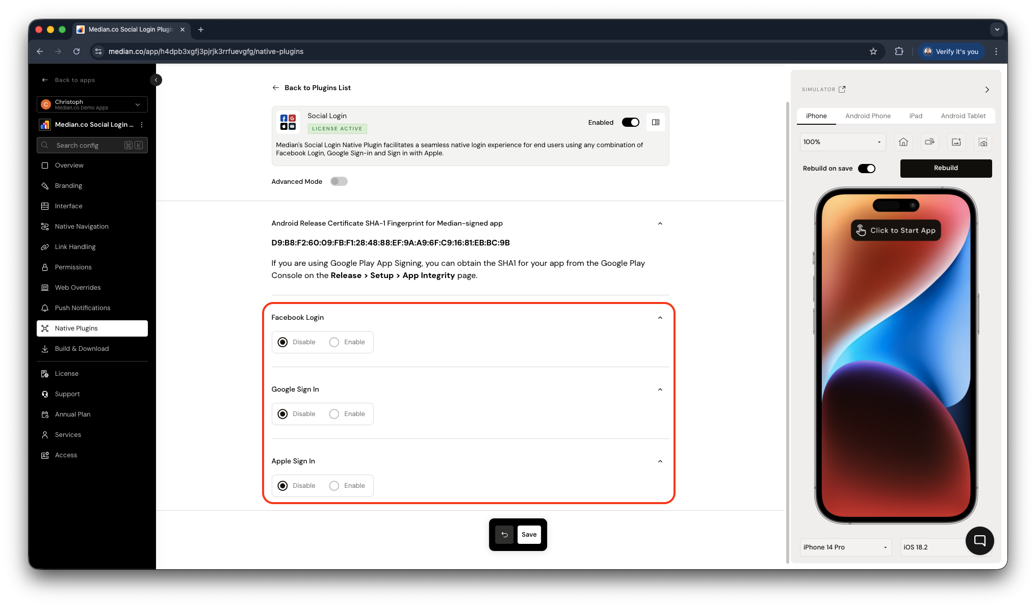 Enter the credentials from Step 1 into your Social Login configuration in Median App Studio.